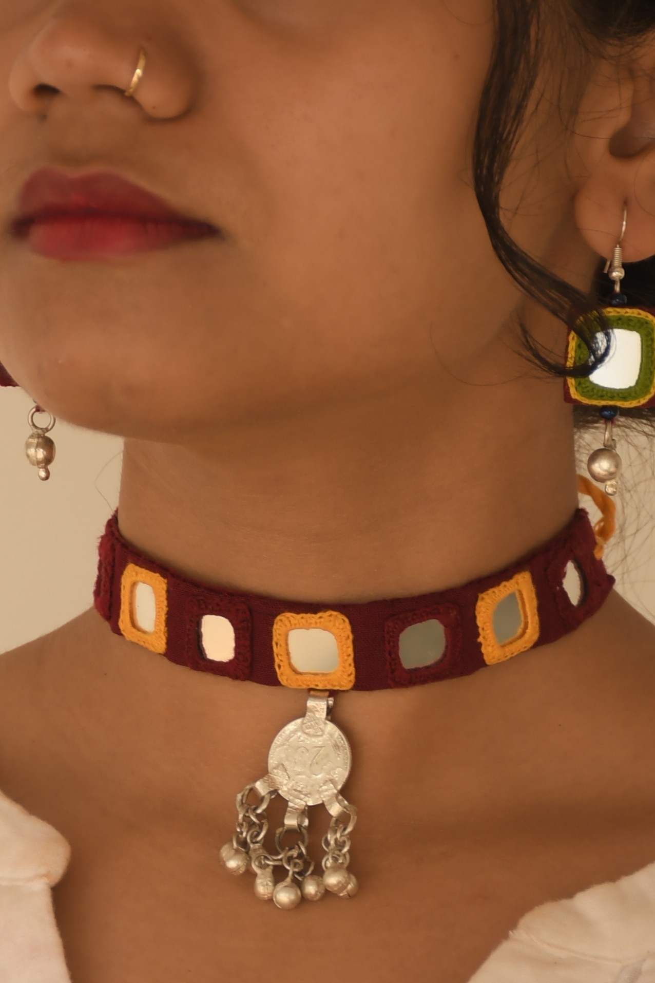Handcrafted Cotton Choker with Intricate Mirror Work and Antique 25 Rupees German Silver Coin – Finished with Expert Final Stitching for a Timeless, Ethnic Look.